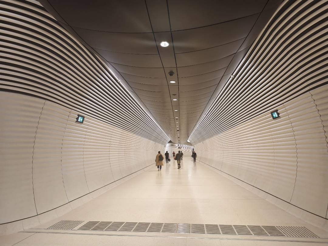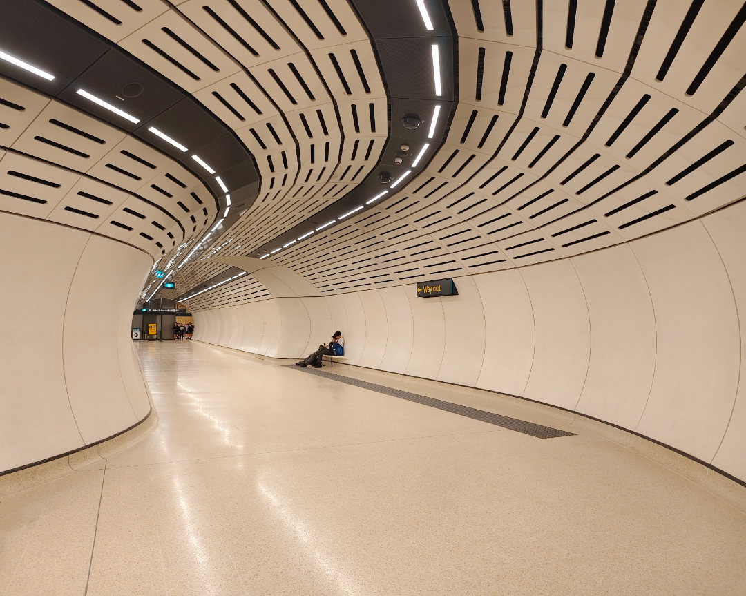 Martin Place站是悉尼地鐵的標(biāo)志性站點(diǎn),項(xiàng)目同樣也是采用GRC幕墻材料,其裝飾設(shè)計(jì)體現(xiàn)了GRC材料的技術(shù)創(chuàng)新。車站采用大尺度GRC曲面吊頂尤為引人注目,通過(guò)精確的模具制作和安裝技術(shù),營(yíng)造出美觀的整體效果,進(jìn)一步提升了材料的性能和表現(xiàn)力。GRC材料的輕質(zhì)特性使得大跨度吊頂成為可能,同時(shí)其良好的聲學(xué)性能提升了車站的聲環(huán)境質(zhì)量。